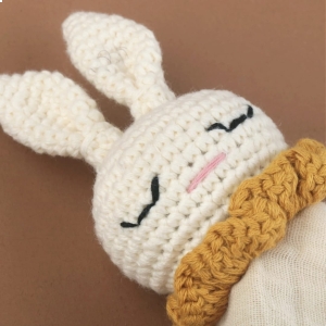 Este dou dou artesanal combina a suavidade da musselina com delicados detalhes em croché e um amigurumi à escolha, criando uma peça única, encantadora e cheia de carinho.