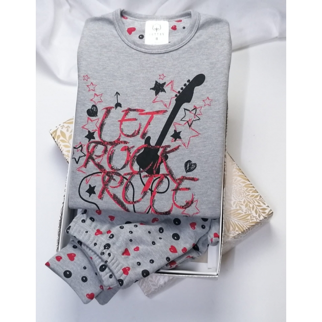 20CC-058 PIJAMA MENINA CARDADO C/ GOLA REDONDA CALÇA CORAÇOES( LET ROCK RULE )