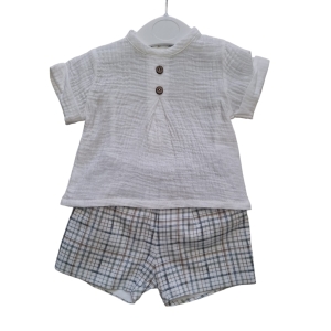 Ref:9049 CONJUNTO MENINO CRÚ/ XADREZ VERDE E BEGE - Coleção Primavera/ Verão